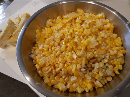 材料 トウモロコシ 1本(皮つきで400G程度が目安) お米 3合 塩 小さじ1 調理方法 ① トウモロコシの粒を包丁でそぎ落とす。 半分か3分の1に切り、まな板に対しタテにおくとやりやすいです。 ② 炊飯器にセットします。 お米は3合とぎ、水は基準通り、塩…