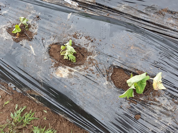 マルチは、保温と保水、防草効果がある他、伸びたツルが根付きにくくなります。