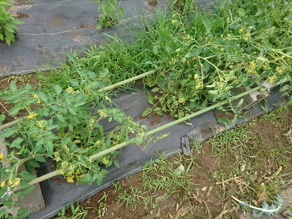 週1回の畑管理で作業が間に合わなくなるのが、支柱を立てたトマト栽培。