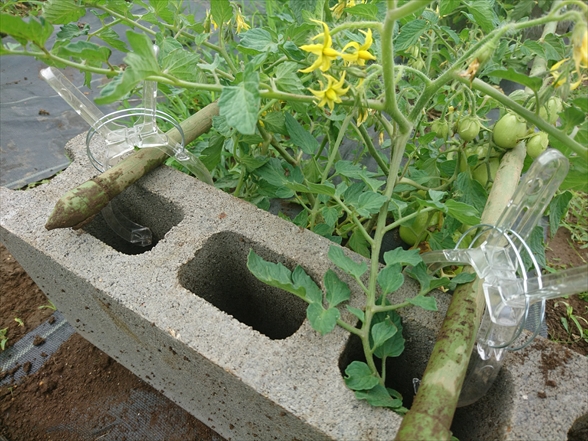 こんな感じで、軽量ブロックと支柱をつかって、はさみあげるようにして株元を浮かせるようにしました。
