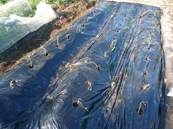 * 写真の植え方はよくないです。穴まわりは土で埋めることをオススメします。夏日にマルチの穴まわりからあがる熱で、苗が枯れたり傷む心配があります。